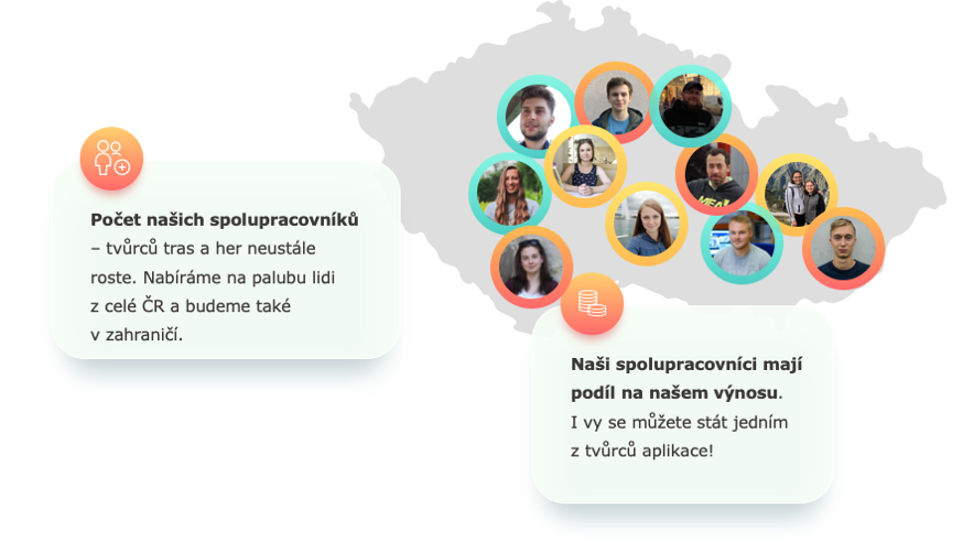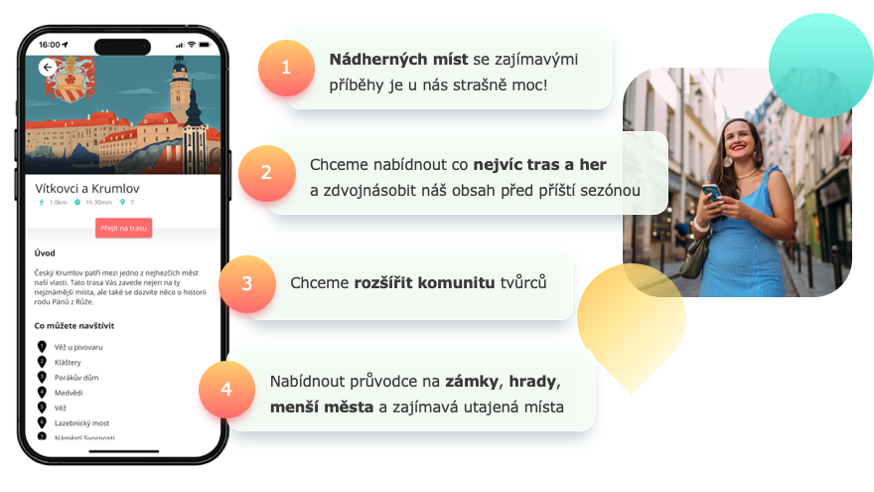 Čím déle na aplikací pracujeme, tím více krásných míst a zajímavých příběhů se nám schází na stole. Abychom je dokázali zpracovat a být tak skutečnou inspirací pro výlety po celém Česku, potřebujeme vaši pomoc. Rádi bychom minimálně zdvojnásobili počet her a také počet našich průvodců, kteří do obsahu dávají své znalosti a také srdce.