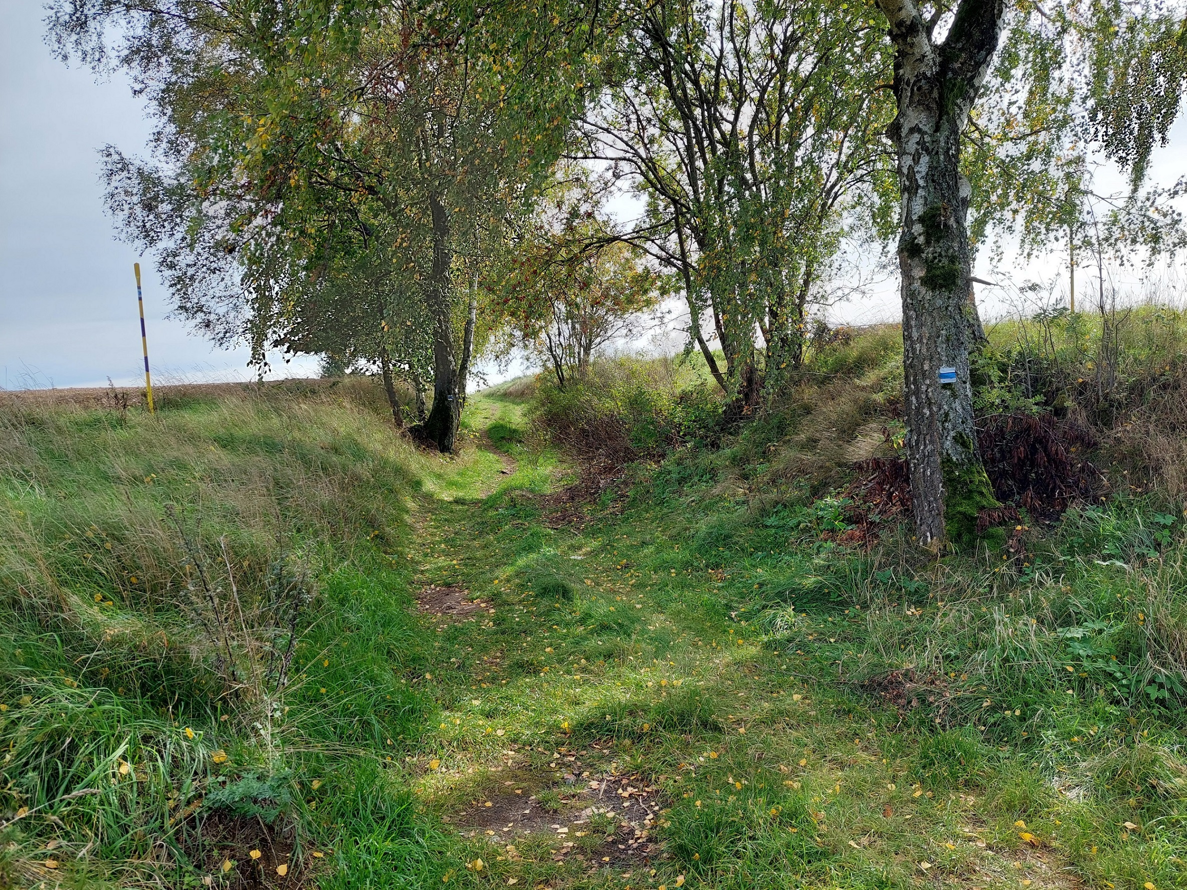 Po dalších necelých 300 m přicházíme ke zpevněné široké cestě, po které vede i ŽTZ Hřebenovka. Cestu i ŽTZ přejdeme a vydáváme se šikmo vpravo odbočující úvozovou cestou, která se vzápětí (po 50 m) rozdvojuje. My použijeme cestu stáčející se vlevo. Po této cestě jdeme asi 350 m, až přicházíme na lesní křižovatku, kde jedna cesta odbočuje vpravo, jedna pokračuje přímo na sever a naše cesta odbočuje mírně vlevo, po které se vydáváme směrem na severozápad. Že jdeme dobře, poznáváme podle občasných dvojic bílých pruhů na stromech po levé straně cesty. Po 220 m je další rozcestí, kde z cesty po které jdeme, odbočuje cesta vpravo, ale také málo znatelná cesta mírně vlevo. Jsme na místě, odkud vedly dvě trasy Hřebenové cesty. Ještě než si jednu z tras vybereme, tak můžeme odbočit po cestě vpravo a objevit zbytky zaniklé samoty Fischerhof. Chceme-li jít po starší trase, tak se vydáváme prostřední cestou přímo a po 250 m přicházíme na rozlehlou louku. Chceme-li se vydat mladší trasou, odbočíme na méně znatelnou cestu vlevo a po chvilce vidíme u cesty krmelec se seníkem na kůlech (2023). Krmelec míjíme zprava a po 100 m přicházíme k ruinám bývalého hostince Elsterquelle, které leží na jižním cípu rozlehlé louky.