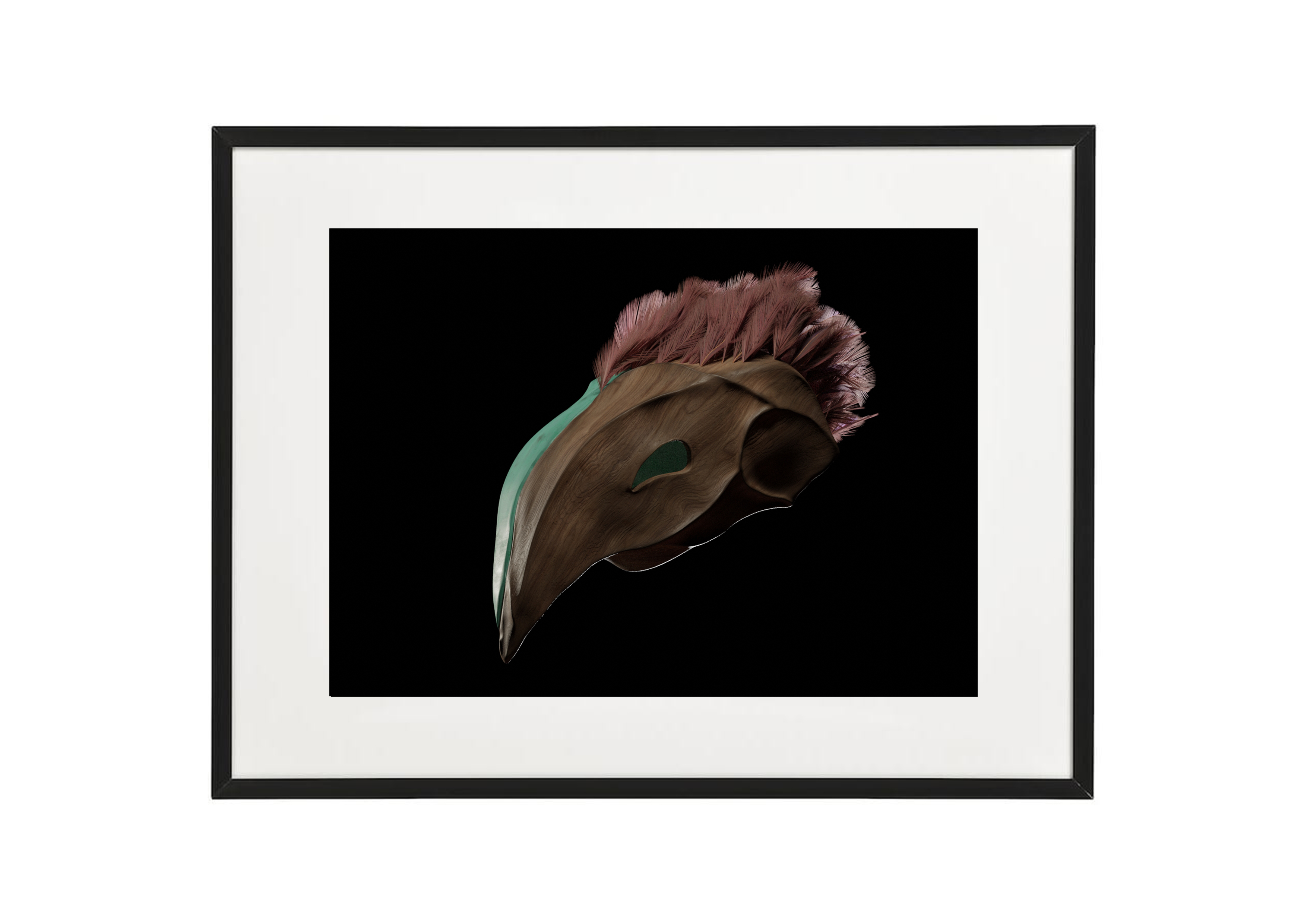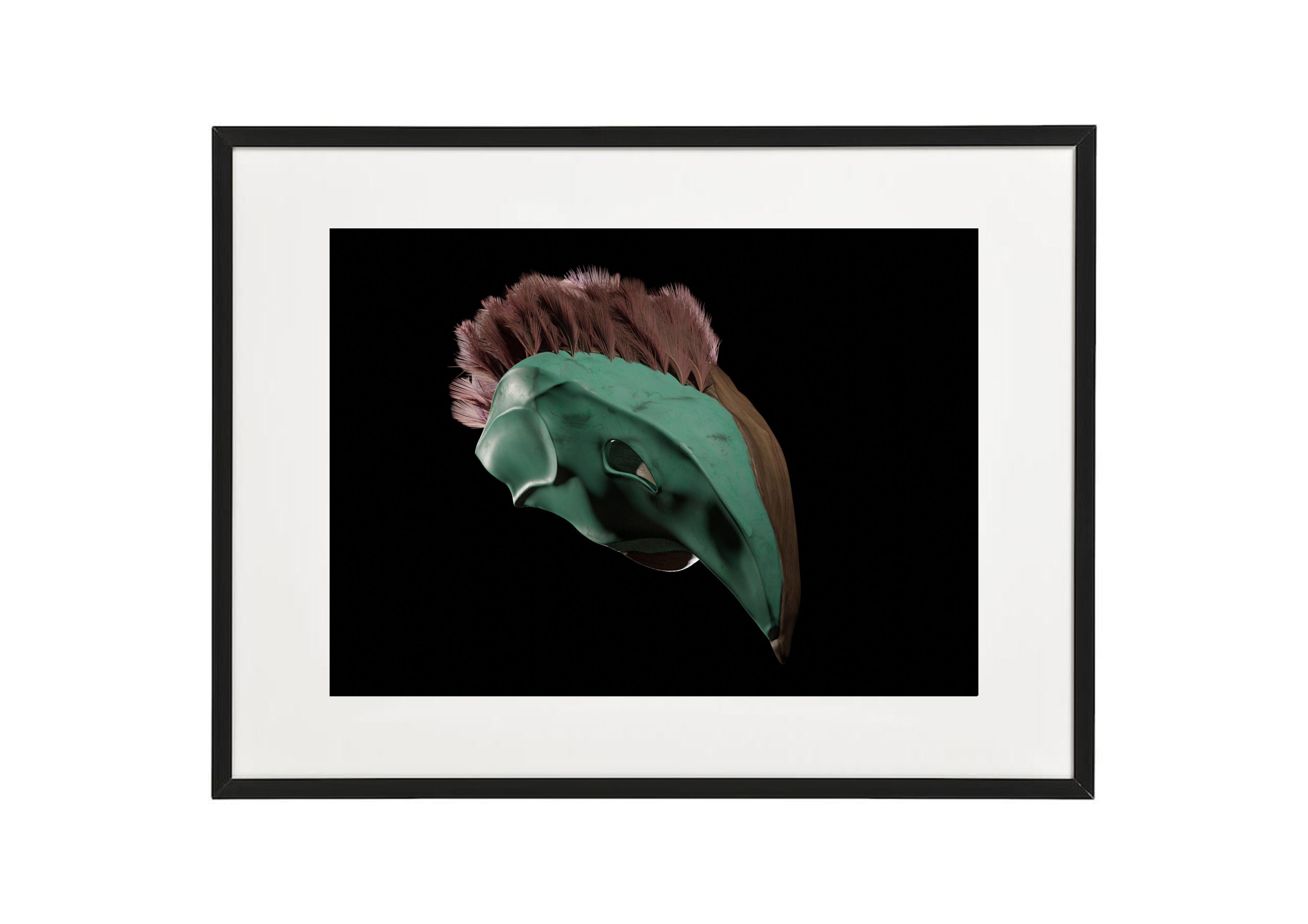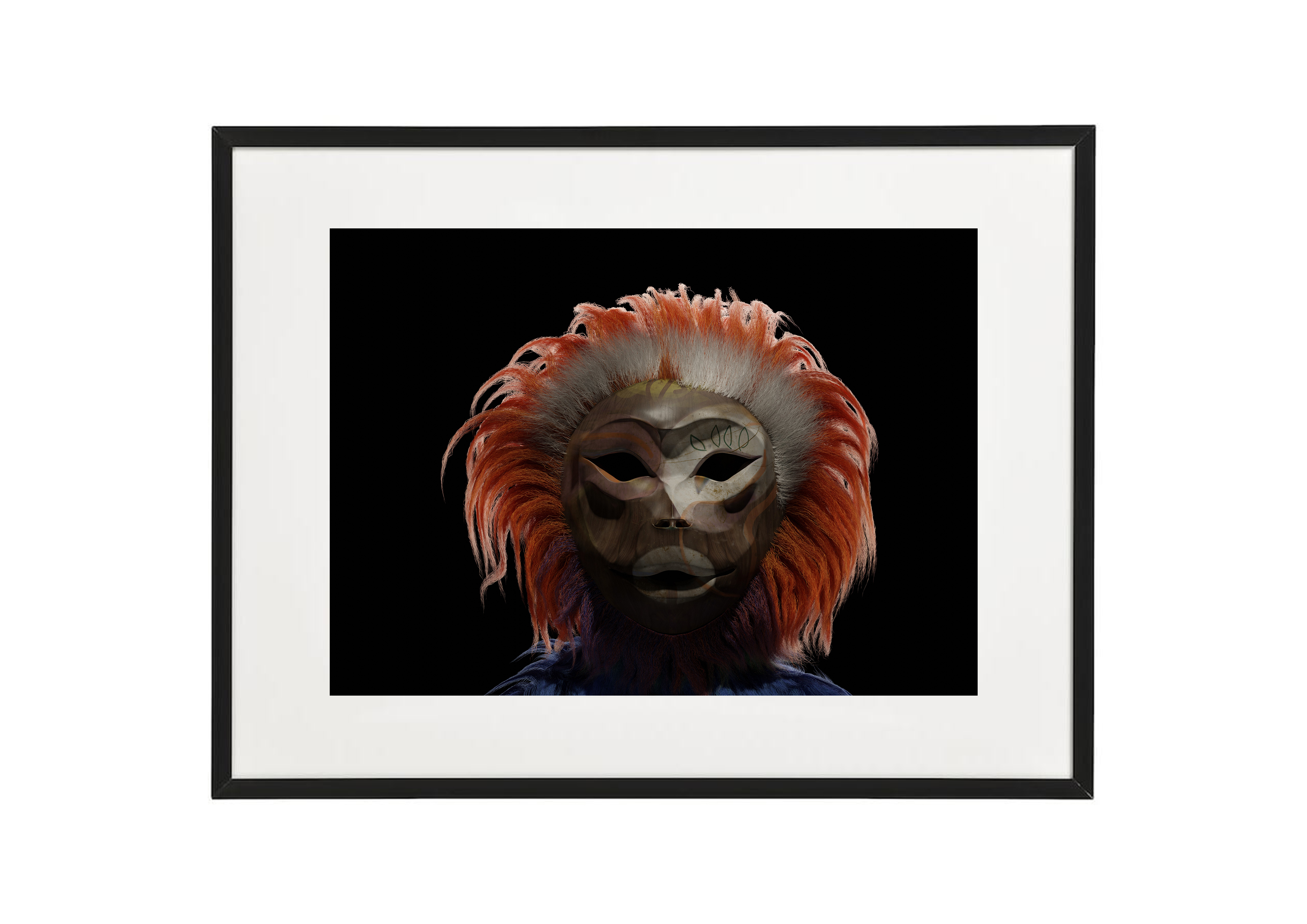Zarámovaný a podepsaný autorský 4K tisk ze série Birdface, rituální maska Slunečního psa.Velikost rámu obrazu, který si můžete vybrat, je 40×50cm a 30×40cm.