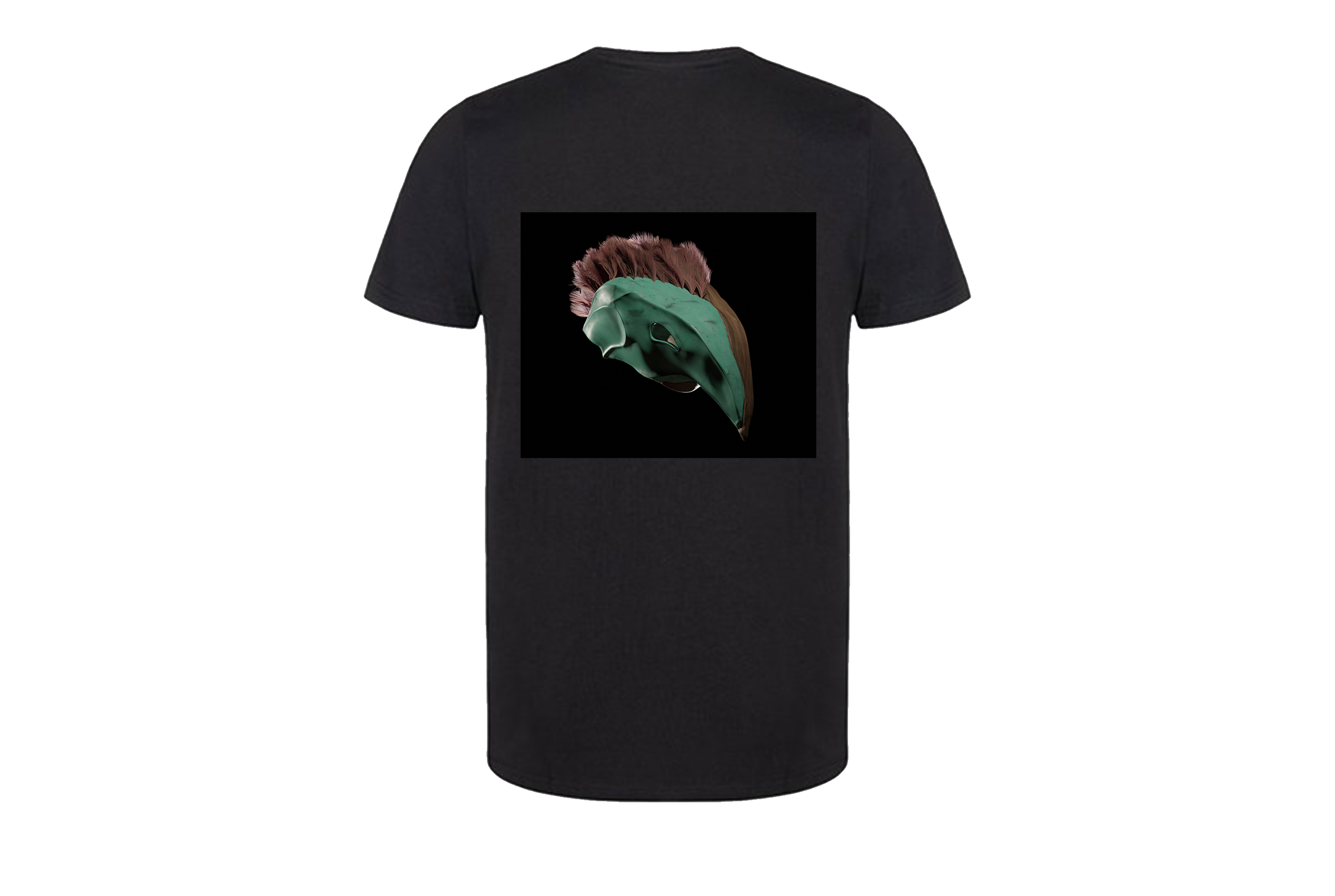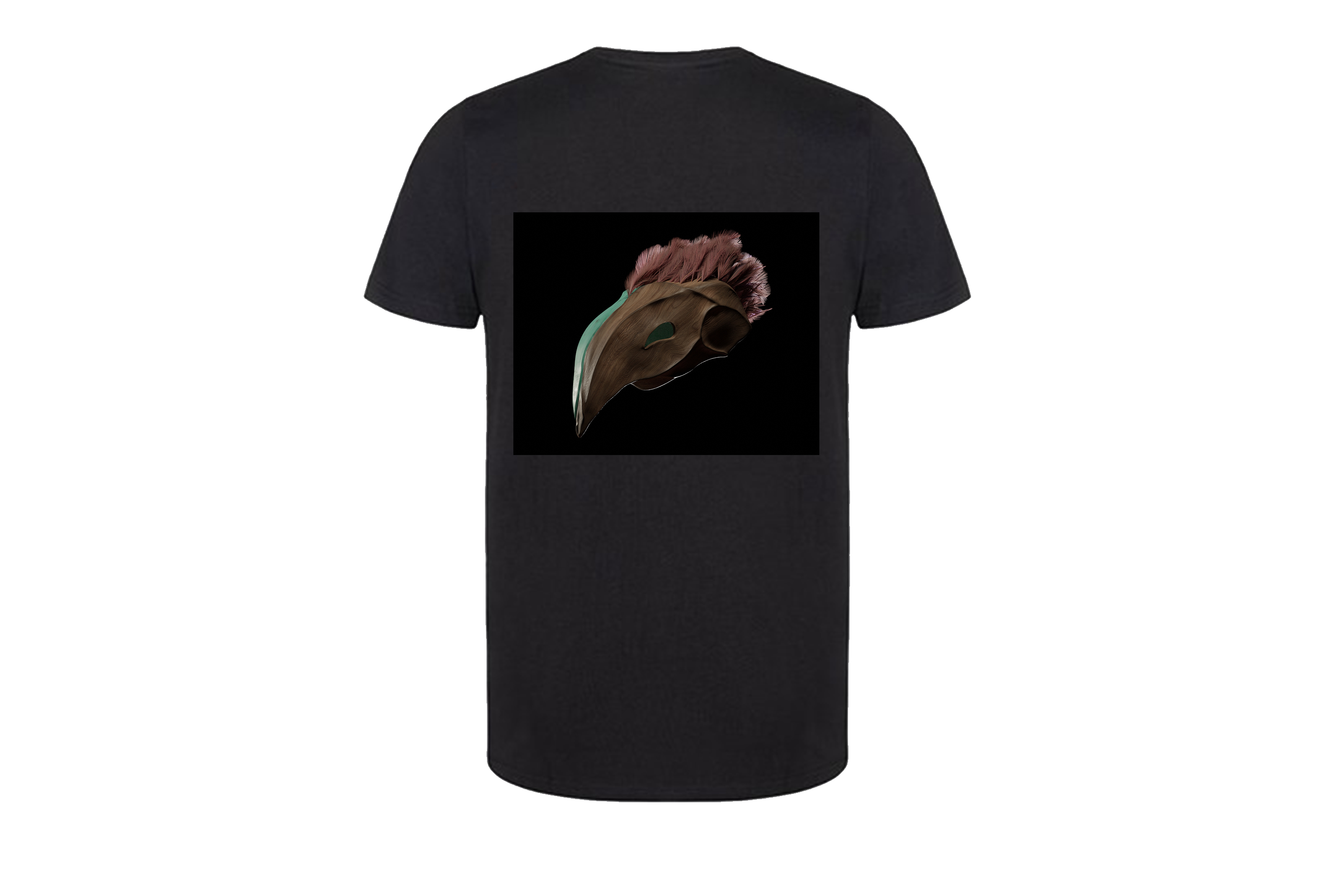 Trička s autorským potiskem rituální masky ze série Birdface.