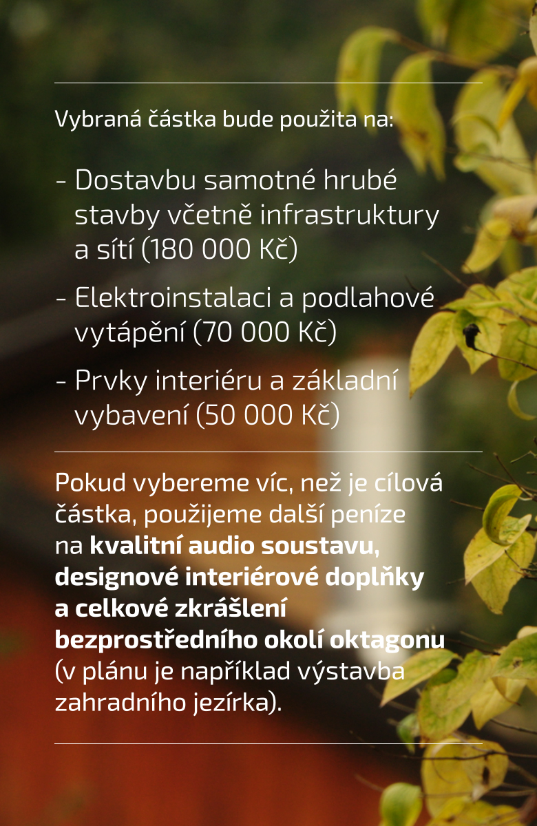 Pokud vybereme víc, než je cílová částka, použijeme peníze navíc na kvalitní audio soustavu, designové interiérové doplňky a celkové zkrášlení bezprostředního okolí oktagonu (v plánu je například výstavba zahradního jezírka).