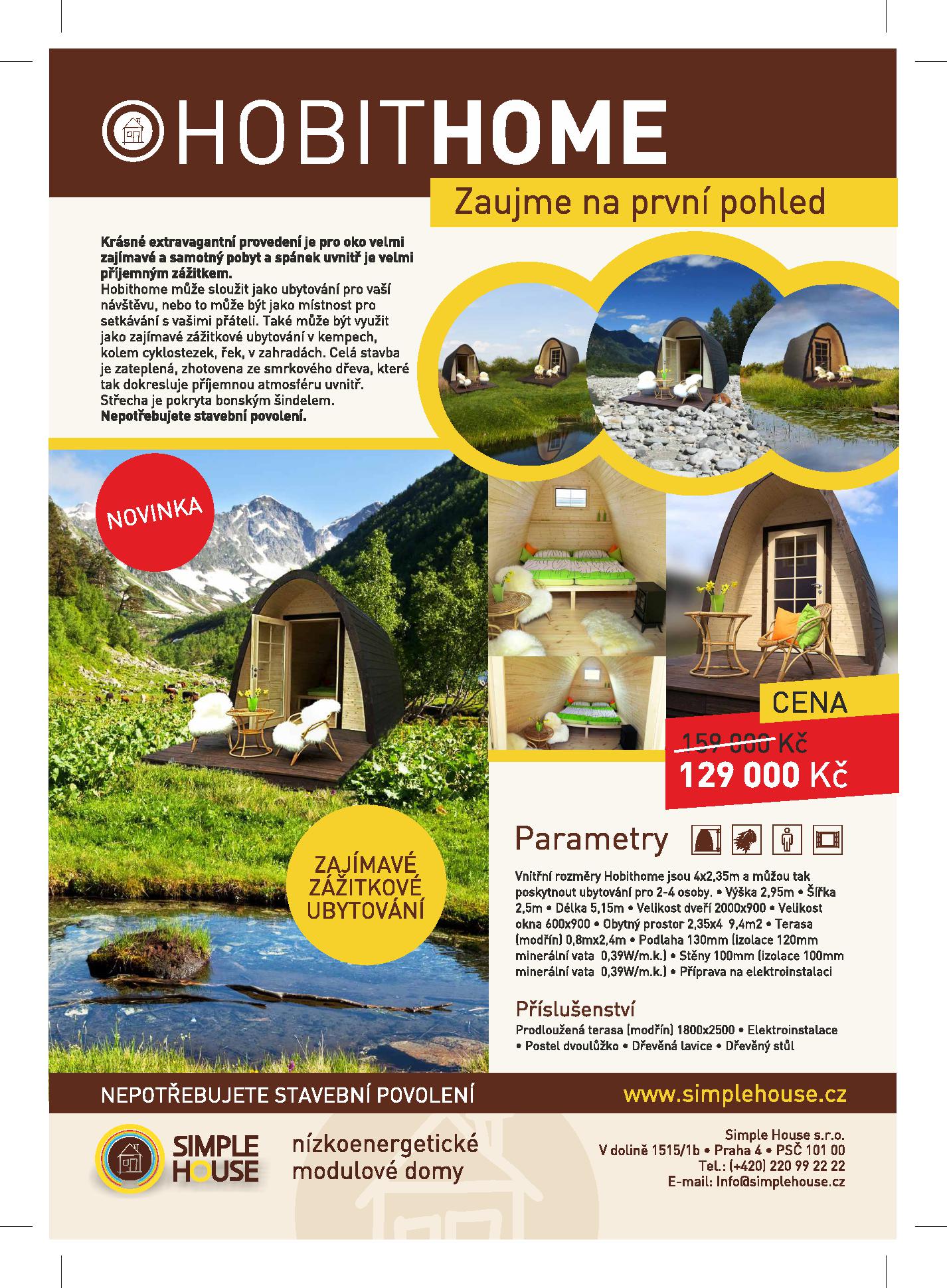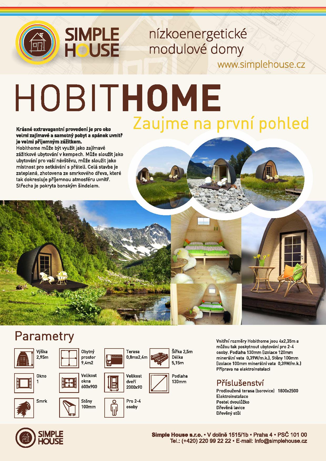 Celý koncept je tvořen samostatnými Hobitími stavbami, jejichž bližší specifikaci uvádíme v tomto projektu a ve fotogalerii v úvodu. Na pořízení jednoho kompletního a vybaveného „Hobit Home“ je počítáno s investicí ve výši 129 tisíc korun a umístěn může být na svém místě okamžitě.